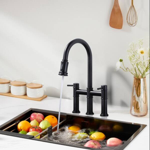 Double Handle Pull-Down Bridge Kitchen Faucet with Brass and Stainless Steel in Oil Rubbed Bronze