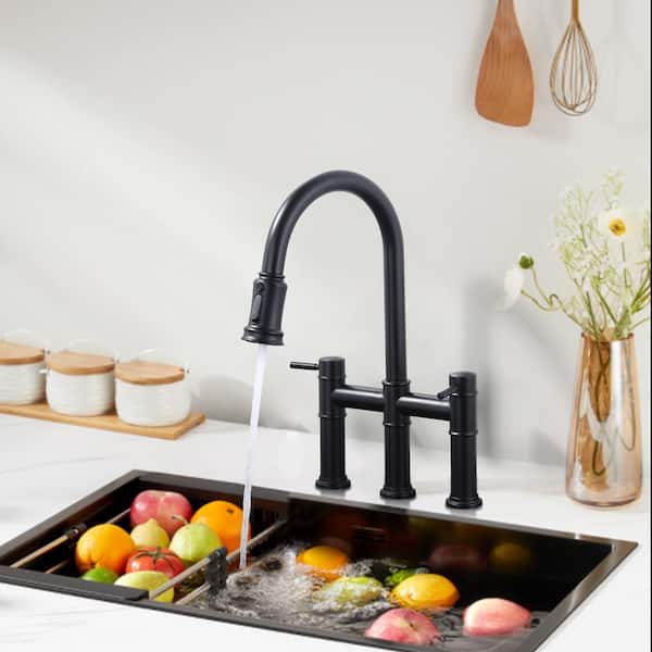 Double Handle Pull-Down High Arc Bridge Kitchen Faucet with Brass and Stainless Steel in Matte Black