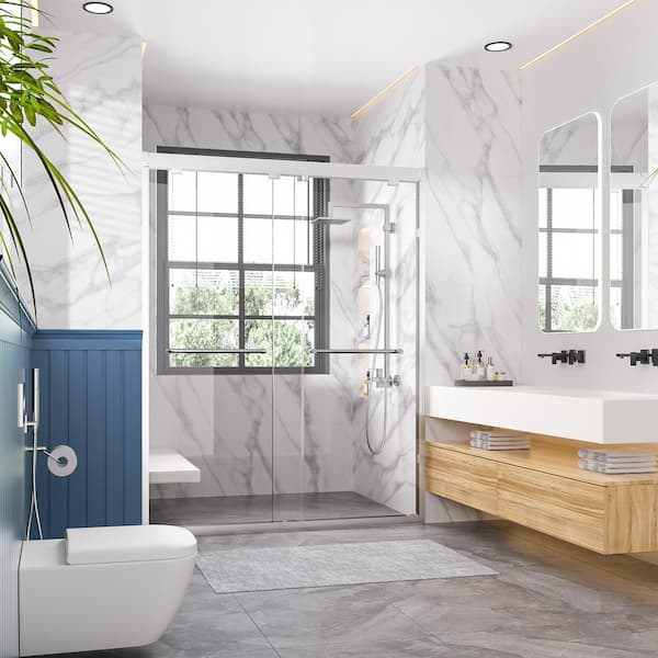 Modern 60 in. W x 76 in. H Double Sliding Framed Shower Door in Silver with 1/4 in. (6 mm) Clear Glass