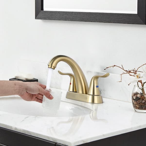 Modern High Arc 4 in. Centerset Double Handle Bathroom Faucet with Lift Rod Drain Kit in Brushed Gold