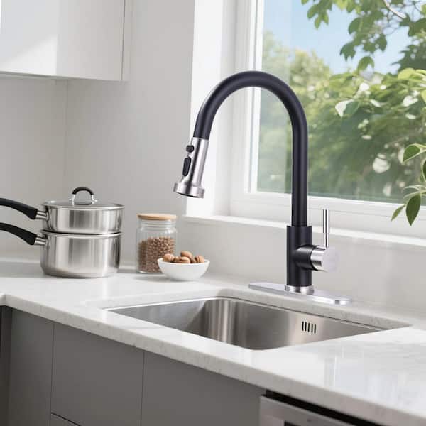 Nickel and Black 15.5 in. 2-Mode Single Handle Pull Down Sprayer Kitchen Faucet with 360° Swivel Spout and Deckplate