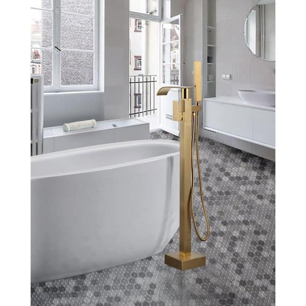 Single-Handle Brass Freestanding Tub Faucet with Hand Shower, Waterfall Floor Mount Bathtub Filler in. Brushed Gold