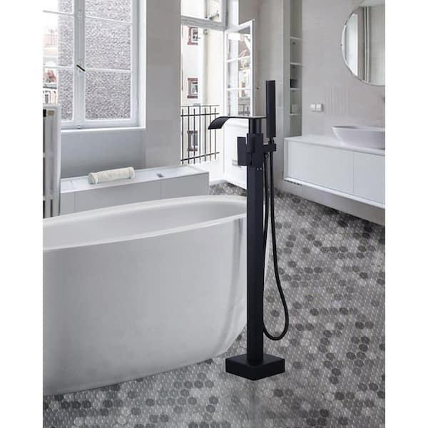 Single-Handle Brass Freestanding Tub Faucet with Hand Shower, Waterfall Floor Mount Bathtub Filler in. Matte Black