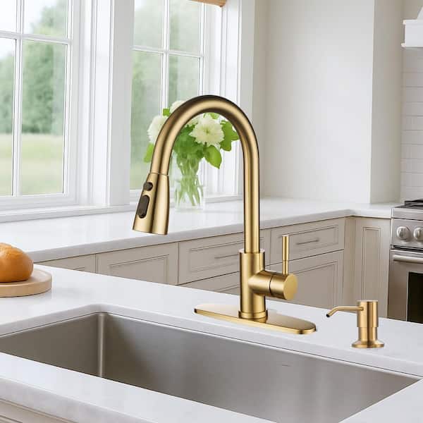 Single Handle Pull Down Sprayer Kitchen Faucet with 3-Function Sprayer and Soap Dispenser in Brushed Gold