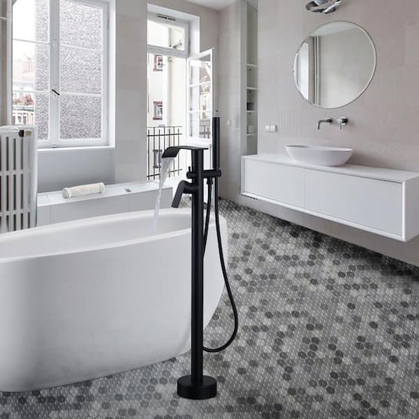 Waterfal Single-Handle Freestanding Tub Faucet in Matte Black, Floor Mount Tub Filler with Handheld Shower