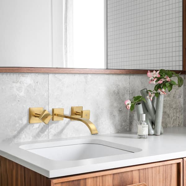 Waterfall Double Handle Wall Mounted Bathroom Faucet with Rough in Valve and Knob Handle in Brushed Gold