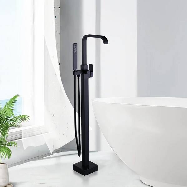 Waterfall Single-Handle Freestanding Floor Mount Tub Faucet Bathtub Filler with Hand Shower in Matte Black