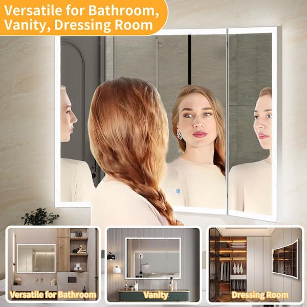 54 in. W x 36 in. H Rectangular Frameless Wall Mounted Trifold Led Bathroom Vanity Mirror in Silver and Dimmer