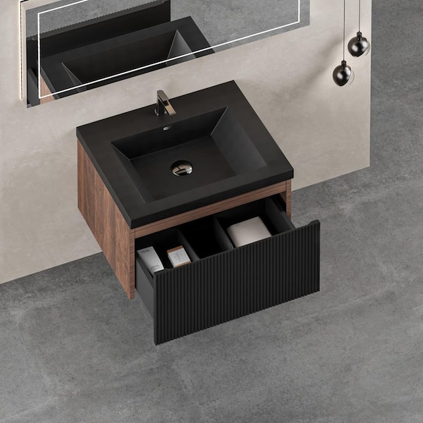 24 in. Wall-Mounted Bath Vanity Modern Floating Bathroom Vanity in Smoked Walnut with Black Quartz Sand Top