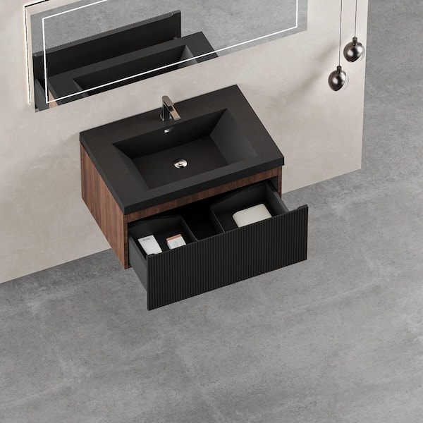 30 in. Wall-Mounted Bath Vanity Modern Floating Bathroom Vanity in Smoked Walnut with Black Quartz Sand Top