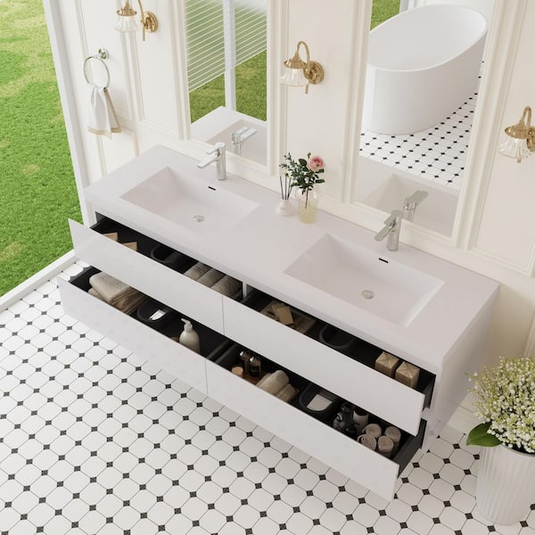 70.87 in. W x 19.69 in. D x 22.44 in. H Wall Hung Bath Vanity in Glossy White with Resin Double Basin Top in White