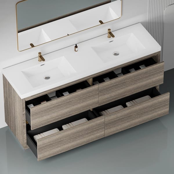 72 in. Freestanding Double Sinks Storage Bath Vanity Cabinet in Ash Grey with White Stone Resin Top