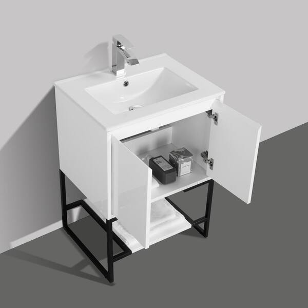 Allen 24 in. Freestanding White Bath Vanity Open-Shelf Bathroom Storage Vanity Cabinet with Glossy White Resin Top Basin