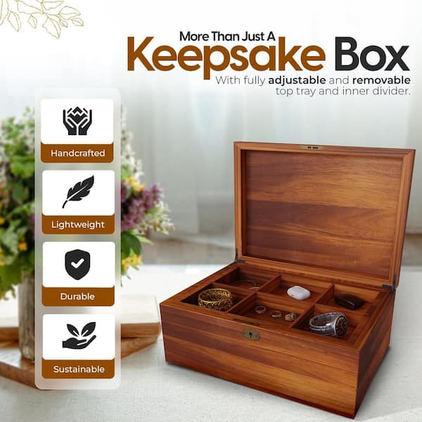 Acacia Wood Box with Hinged Lid and Locking Key, Decorative Wooden Box with Divider, Brown, 11 in. x 9 in. x 5 in.