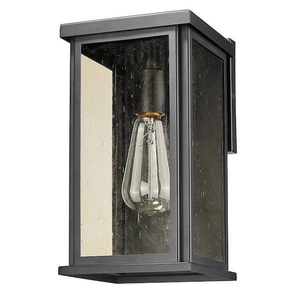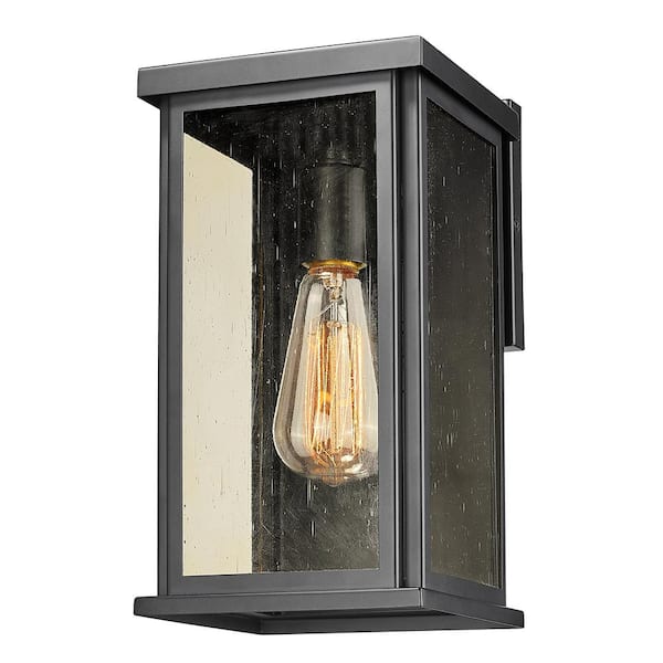 Lyons 11.75 in. Matte Black 1-Light Outdoor Wall Lantern with Seeded ChampagneGlass