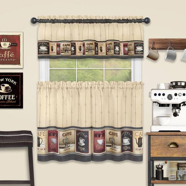 Cozy Café Printed Tier and Valance Set - 58 in. W x 36 in. L Tan-Black