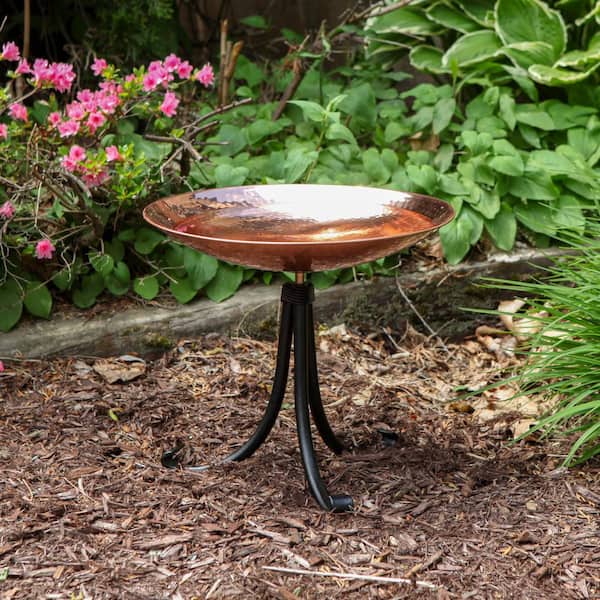 14 in. W Round Polished Copper Plated Stainless Steel Birdbath with Black Wrought Iron Tripod Stand