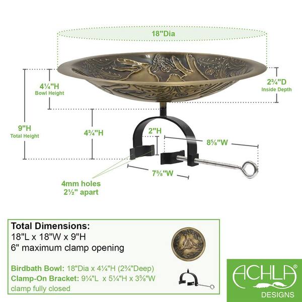 18 in. Dia Round Antique Finished Brass 3-Hares Birdbath w/Black Wrought Iron Over Rail Bracket, Bronze