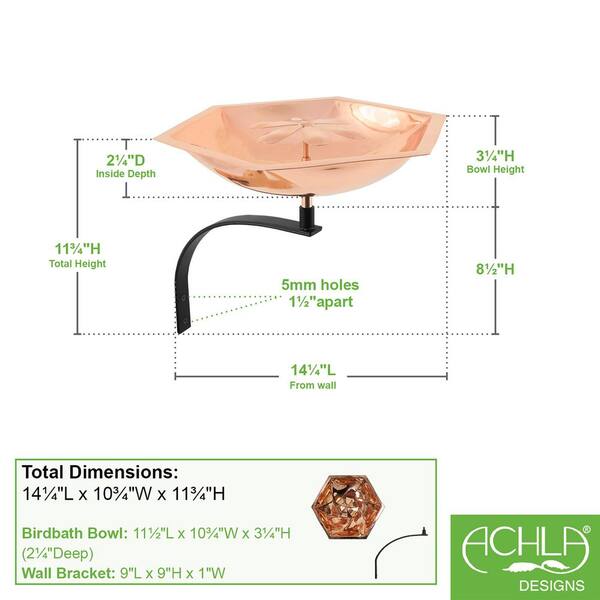 Hexagonal Bee Fountain and Birdbath with Wall Mount Bracket 11.75 in. Tall Copper Plated Finish