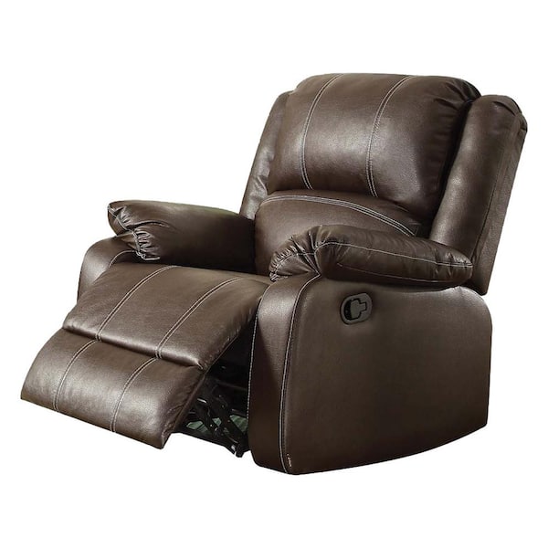 • Brown synthetic leather upholstery with a sturdy wood frame.