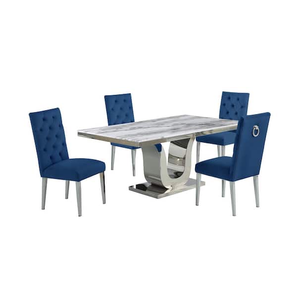 Ada 5-Piece White Marble Top with Stainless Steel Base Table Set with 4-Navy Blue Velvet Chairs with Tufted Buttons