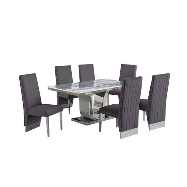 Ada 7-Piece White Marble Top with Stainless Steel Base Table Set with 6-Dark Grey Velvet, Nail Head Trim Chairs
