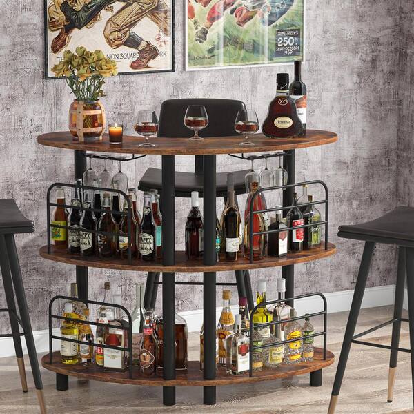 Adan Rustic Brown 41.7 in. Corner Bar Table with Wine Glasses Holder