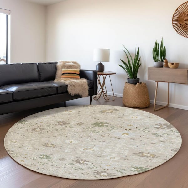 Mayfield Premium Machine Washable Abstract AMF1009 Beige 8 ft. x 8 ft. Round Rug