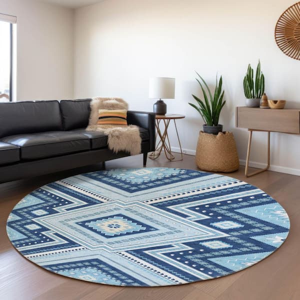 Mayfield Premium Machine Washable Abstract AMF1010 Navy 8 ft. x 8 ft. Round Rug