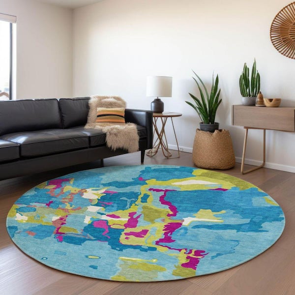 Mayfield Premium Machine Washable Abstract AMF1028 Aqua 8 ft. x 8 ft. Round Rug