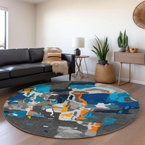 Mayfield Premium Machine Washable Abstract AMF1028 Charcoal 8 ft. x 8 ft. Round Rug