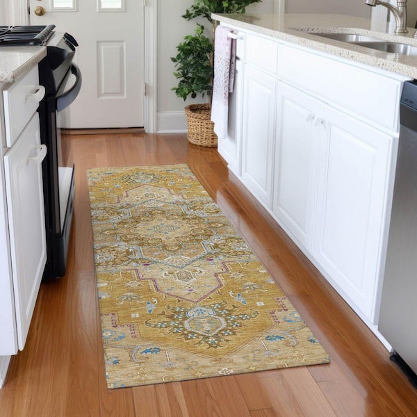 Mayfield Premium Machine Washable Abstract AMF1036 Gold 2 ft. 3 in. x 7 ft. 6 in. Runner Rug