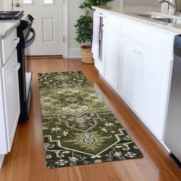 Mayfield Premium Machine Washable Abstract AMF1036 Olive 2 ft. 3 in. x 7 ft. 6 in. Runner Rug