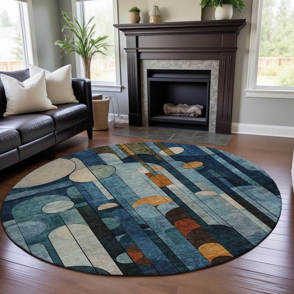 Mayfield Premium Machine Washable Abstract AMF1125 Blue 8 ft. x 8 ft. Round Rug