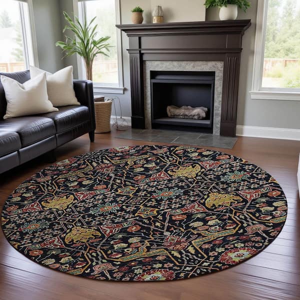 Mayfield Premium Machine Washable Abstract AMF1132 Black 8 ft. x 8 ft. Round Rug