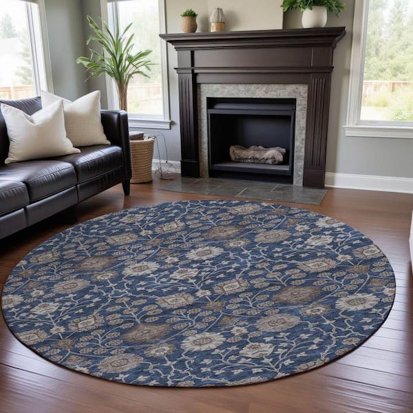 Mayfield Premium Machine Washable Abstract AMF1155 Navy 8 ft. x 8 ft. Round Rug
