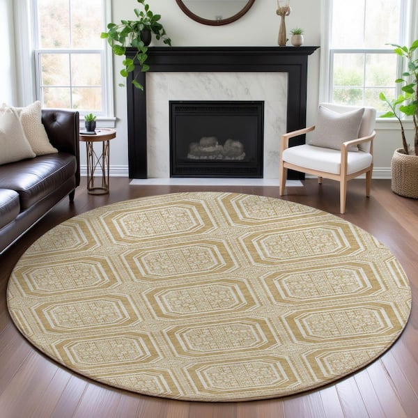 Mayfield Premium Machine Washable Abstract AMF1451 Gold 8 ft. x 8 ft. Round Rug