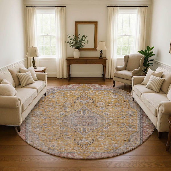 Mayfield Premium Machine Washable Abstract AMF1651 Gold 8 ft. x 8 ft. Round Rug