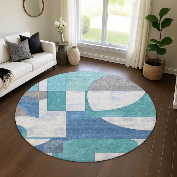 Mayfield Premium Machine Washable Abstract AMF1692 Teal 8 ft. x 8 ft. Round Rug