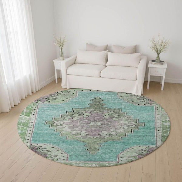 Mayfield Premium Machine Washable Abstract AMF1731 Teal 8 ft. x 8 ft. Round Rug