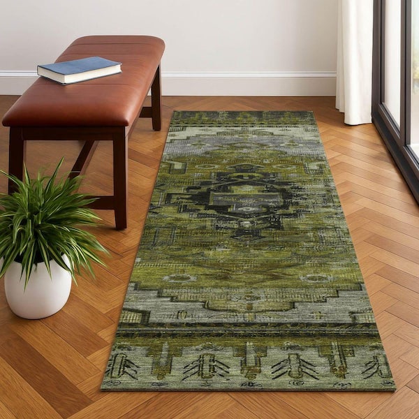 Mayfield Premium Machine Washable Abstract AMF1776 Olive 2 ft. 3 in. x 7 ft. 6 in. Runner Rug