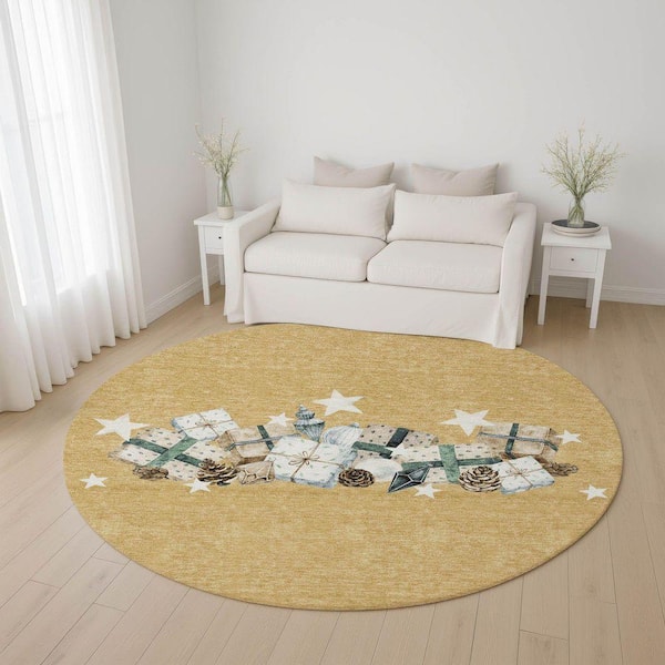 Mayfield Premium Machine Washable Abstract AMF1825 Gold 8 ft. x 8 ft. Round Rug