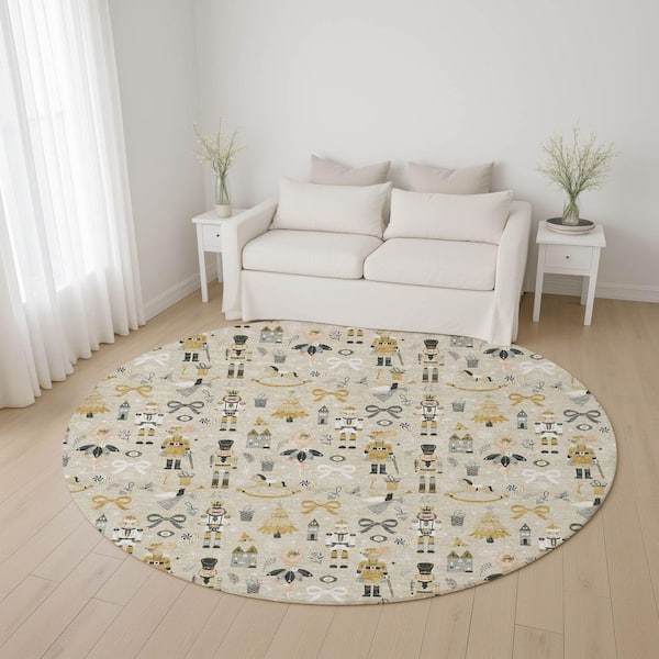 Mayfield Premium Machine Washable Abstract AMF1827 Beige 8 ft. x 8 ft. Round Rug
