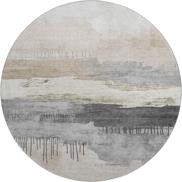 Mayfield Premium Machine Washable Abstract AMF1880 Ivory 8 ft. x 8 ft. Round Rug