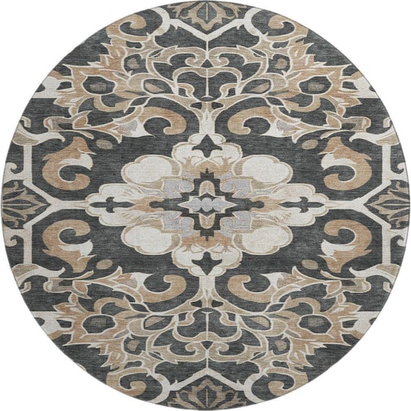 Mayfield Premium Machine Washable Abstract AMF1947 Charcoal 8 ft. x 8 ft. Round Rug