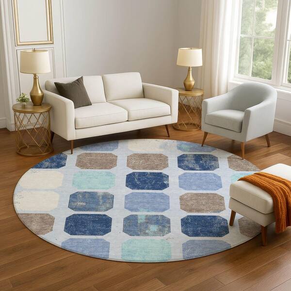 Mayfield Premium Machine Washable Abstract AMF1950 Denim 8 ft. x 8 ft. Round Rug