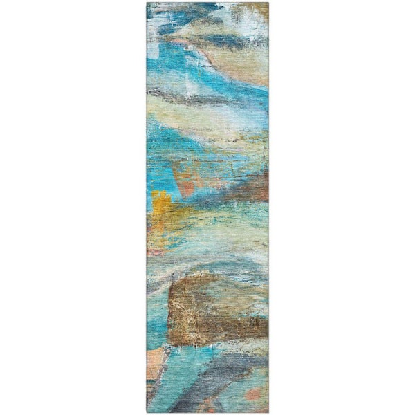 Mayfield Premium Machine Washable Abstract AMF2039 Teal 2 ft. x 7 ft. Runner Rug
