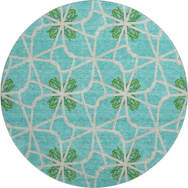Mayfield Premium Machine Washable Abstract AMF958 Aqua 8 ft. x 8 ft. Round Rug