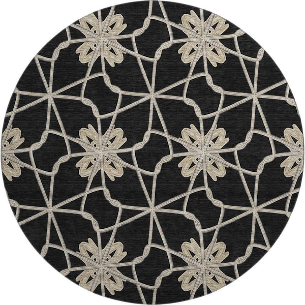 Mayfield Premium Machine Washable Abstract AMF958 Black 8 ft. x 8 ft. Round Rug