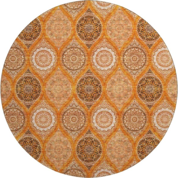 Mayfield Premium Machine Washable Abstract AMF976 Orange 8 ft. x 8 ft. Round Rug